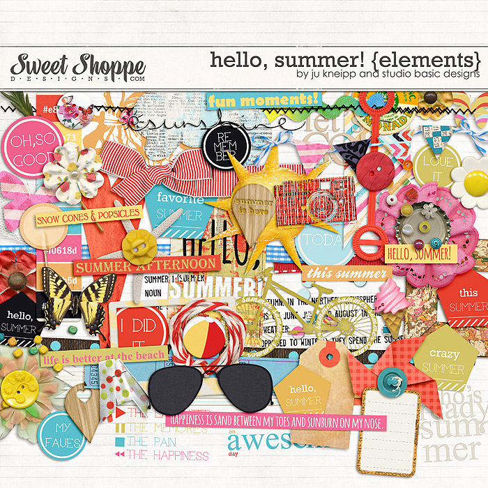The Hello, Summer! bundle contains the Papers, Elements, Splats, Journaling Cards, and Alpha packs. All together, there are 89 bold and bright elements, 23 gorgeous papers, 2 Alphas (one lowercase wood-with-lace alpha includes numbers and some symbols; one uppercase paper alpha with numbers and symbols), and 20 sun-inspired Journaling Cards. All these fantastic pieces can be mixed and matched to create countless warm-weather pages.